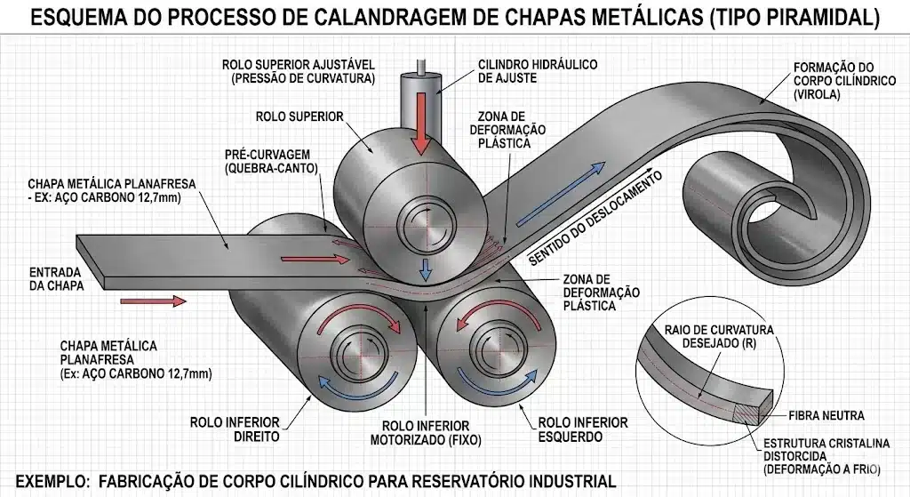 O processo de calandragem é, essencialmente, uma operação de conformação mecânica onde uma chapa metálica plana é curvada ao passar entre cilindros motorizados. Você insere a chapa na máquina e ela é submetida à pressão de um sistema de rolos, sendo deformada plasticamente até atingir o raio de curvatura desejado.