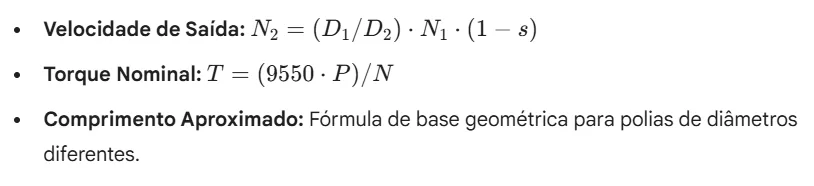 - Velocidade Periférica (Vp): Essencial para a segurança. Velocidades acima de 35 m/s em polias de ferro fundido podem causar falhas catastróficas por força centrífuga.