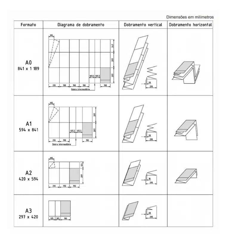 | A0 | 841 × 1189 | 4 dobras | 1 ou 2 dobras | Aproxima-se de A4 |