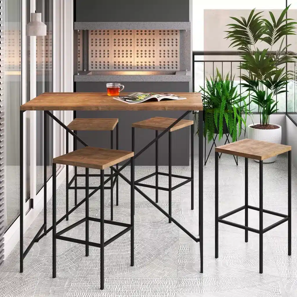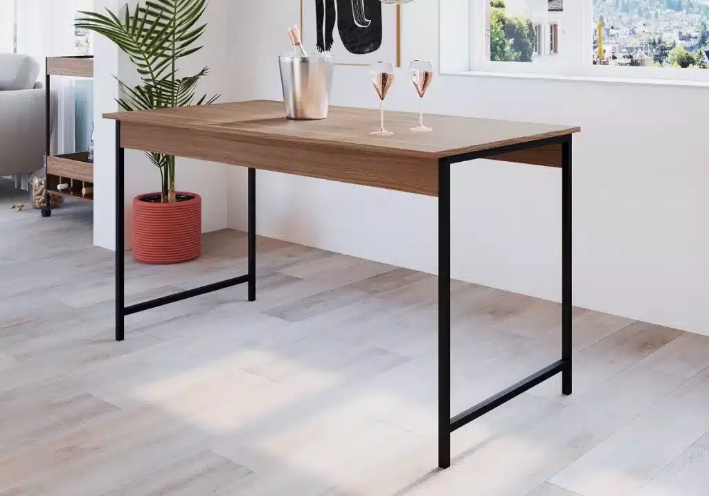 Combinam tampos de madeira maciça, MDF ou vidro com bases metálicas resistentes. Muito utilizadas em cozinhas gourmet, escritórios e áreas de lazer.