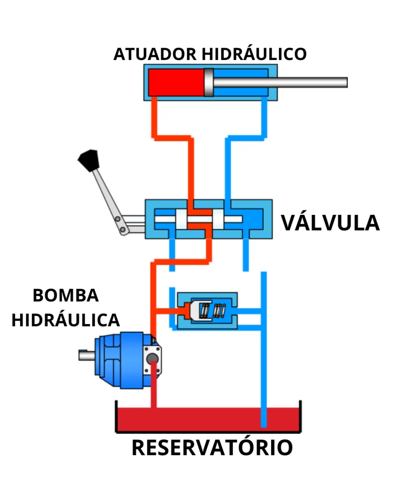 A bomba gera pressão no fluido hidráulico, que é direcionado pelas válvulas para os atuadores, promovendo o deslocamento de cargas ou movimentos precisos.