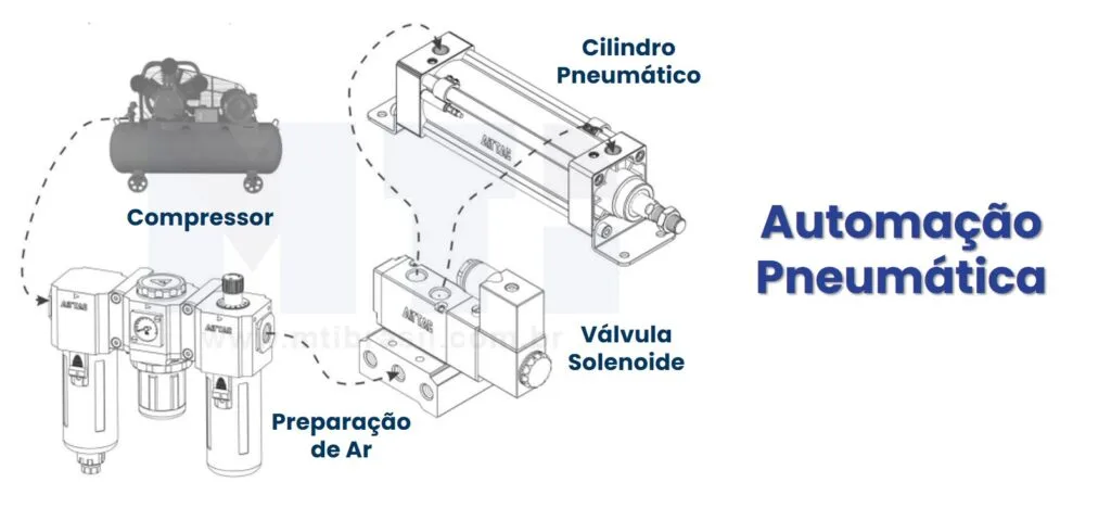 O ar é comprimido por um compressor, tratado (filtrado e lubrificado), armazenado e direcionado por válvulas até os atuadores, que executam o movimento.