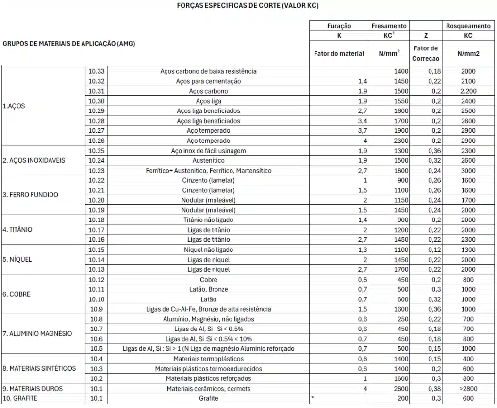 Tabela de Força Específica e Velocidade de Corte para Torno